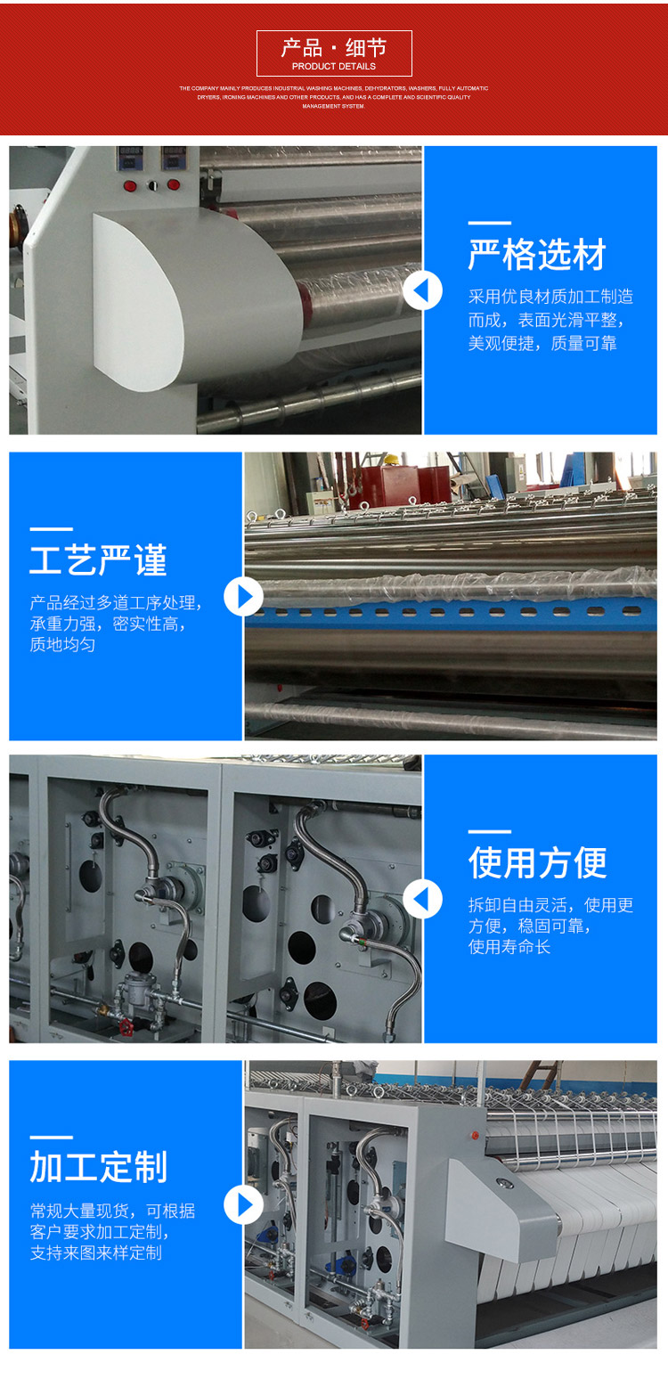 各主燙平烘筒及出布軸之間采用先進差動設計,整平布草、提高熨平質(zhì)量。